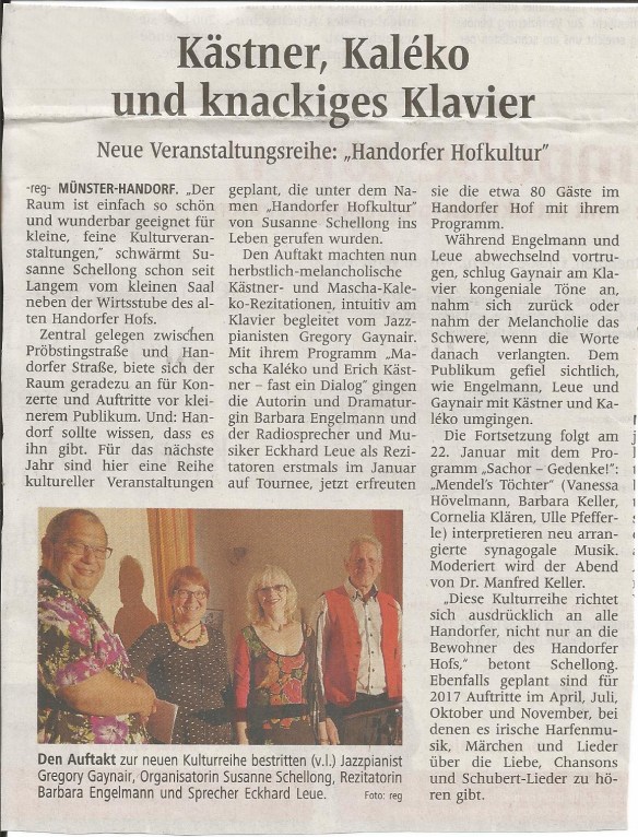 Die Gedichte von Mascha Kaléko und Erich Kästner gehören bis heute zu den meistgelesenen und immer wieder neuaufgelegten Lyrik-Texten in Deutschland. Kästner selbst prägte den Begriff „Gebrauchslyrik“: Sprachliche Virtuosität, die dennoch für jeden verständlich bleibt, weil sie eben das ausdrückt, was uns alle bewegt – im Berlin der späten Weimarer Republik ebenso wie heute, im Zeitalter von elektronischer Kommunikation und Social Media. MK & EK – im Dialog In den zwanziger und dreißiger Jahren des letzten Jahrhunderts verkehrten Mascha Kaléko und Erich Kästner, zwei exemplarische Dichter der neuen Sachlichkeit, im legendären Romanischen Café und anderen Literatentreffs in Berlin, schrieben für dieselben Zeitungen und kamen wohl doch kaum persönlich miteinander ins Gespräch. Erich Kästner sah selbst mit an, wie 1933 auf dem Berliner Opernplatz seine Bücher verbrannt wurden. Auch Mascha Kaléko durfte als Jüdin im nationalsozialistischen Deutschland ihren Beruf nicht mehr ausüben und emigrierte 1938 mit ihrer Familie in die USA. Bei Mascha Kalékos erstem Deutschlandaufenthalt nach dem Holocaust treffen die beiden Dichter mehr oder weniger zufällig zusammen, in München anlässlich einer Feier zum 100. Todestag von Heinrich Heine, ihrem „Dichtervater“: bei angeregten Gesprächen konstatieren sie ihre poetische Verwandtschaft und gegenseitige Sympathie. Das ist alles. Kein weiteres Treffen, kein Briefwechsel ist dokumentiert. Aber wenn wir heute diese Texte lesen, mit ihren vielen Facetten und Nuancen, der Musikalität und Rhythmik der Verse, der Leichtigkeit, dem schnodderigen Berliner Tonfall, der scharfen und zeitkritischen Beobachtung sowie der Melancholie und der tiefen Einsicht ins menschliche Dasein – dann wird ihre gegenseitige Nähe unweigerlich spürbar. Wir stellen uns nun vor, dass diese beiden Dichter sich heute – oder irgendwann, irgendwo – zu einem poetischen Dialog zusammenfinden, zu einem Austausch, der in ihrem Leben wohl in dieser Weise nicht stattgefunden hat, obwohl er so naheliegend erscheint. Wer weiß – vielleicht haben sie ihn auf einer ganz anderen Ebene ja doch geführt? Barbara Engelmann und Eckhard Leue geben den Dichtern ihre Stimmen und der Pianist Gregory Gaynair formt die Gedichte zu musikalischen Rezitationen, zu Balladen und Songs mit den unterschiedlichen Farben des Jazz, Blues, Traditional bis hin zur Klassik… Texte und Musik nehmen einander auf und verschmelzen…